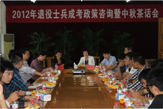 会上,成人与继续教育学院负责人介绍了2011年以来我校开展退役士兵职业技能教育培训的基本情况,为参加报考我校的退役士兵解读了2012年成人高考政策的有关问题并提出了要求。